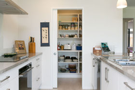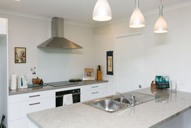 Wow what a kitchen! There was plenty of room to hide your collection of bowls, plates, bone china, preserves in the walk in pantry. Pendant lights over the main bench add to the appeal, and we loved the fact that you could cook easily with the well positioned cook-top/oven, bench, fridge and pantry. A far cry from the old farmhouse kitchen!