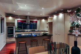 The entertainer's kitchen enjoys views into the garden and adjoins the family dining/ living room.