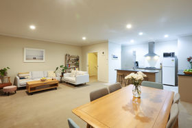 Open plan living, kitchen and dining open out to generous north facing patio, perfect for entertaining and enjoyment of the gorgeous low maintenance garden and restful setting.